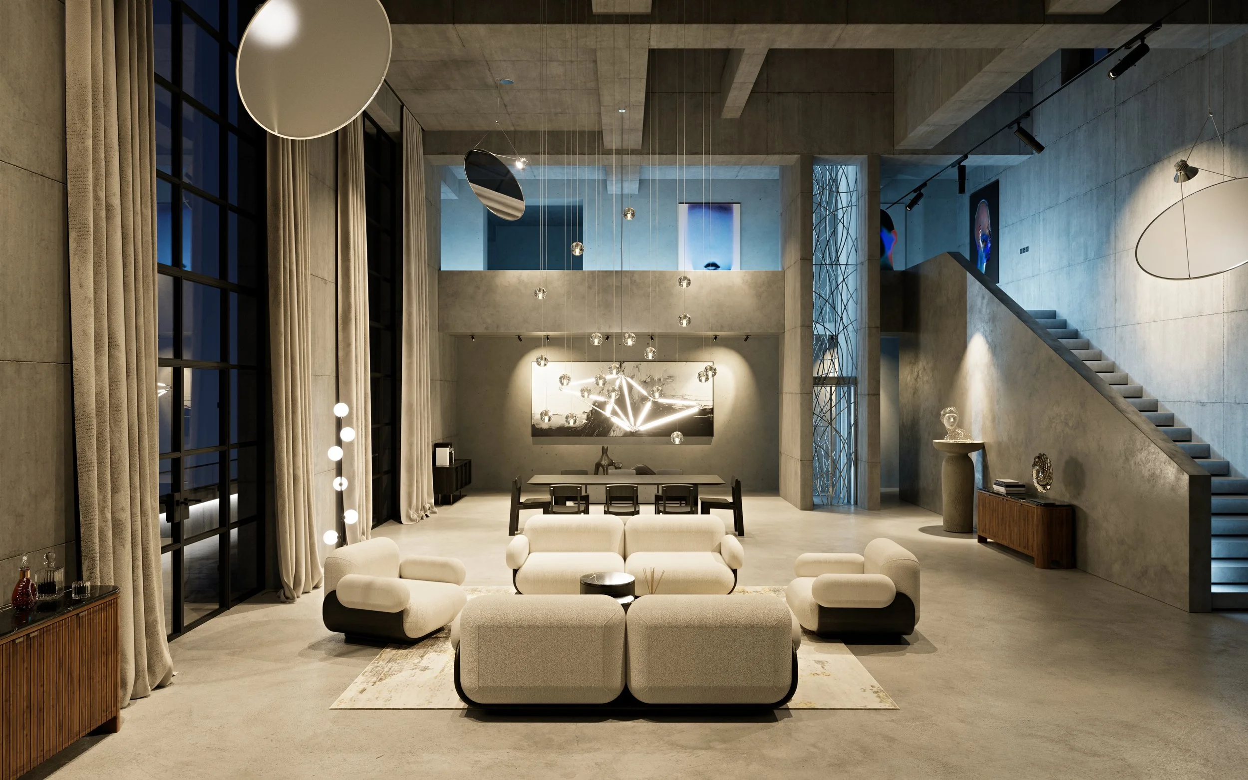 At night, the space transforms under a controlled palette of light—cool tones reflecting on the concrete, warm highlights on wood—creating a cinematic stillness that reflects both the city’s industrial rhythm and the owner’s contemplative lifestyle.